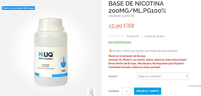 Yo voy a pedir. Es fiable esa nicotina? Me parece demasiado barata. Corregidme si me equivoco. Yo voy a comprar 1 litro de 36mg en VG que cuesta 26 euros. Eso son 36.000 mg de nico. Los botecitos de España son de 20mg, es decir, un bote de 10ml trae 200mg de nico. Dividimos 36.000/200 para averiguar cuantos botes equivale. Serian 180. A 1 euro el bote son 180 euros frente a 26 que cuesta el litro. Realmente es asi? Es buena esa nicotina?