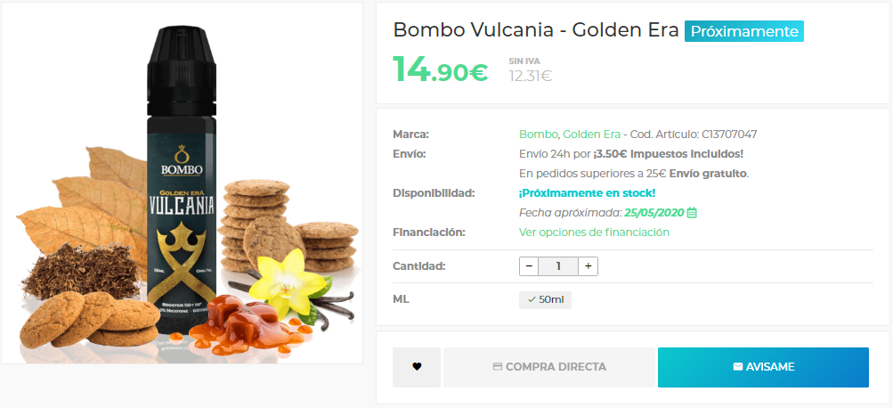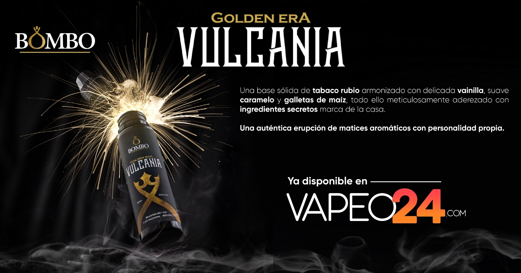 ¡Muy pronto tendréis disponible en Vapeo24 el próximo y tercero de los lí­quidos de la gama Golden Era de Bombo: Vulcania! Tabaco rubio armonizado con vainilla, caramelo y galletas de maí­z, meticulosamente aderezado con ingredientes secretos.Una erupción de matices aromáticos con personalidad propia.